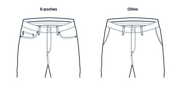 Choisissez le style qui vous convient le mieux - que ce soit le design classique à 5 poches ou le modèle chino habillé - les deux options o!rent confort, qualité et ajustement parfait, conçus sur mesure pour vous.